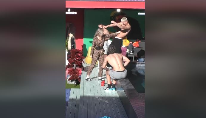 Teksa po qëndronte me Londrimin dhe të tjerë, ajo shtyu banorin në fjalë, në pishinë,