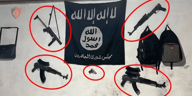 Gjatë kontrollit të banesës, policia sekuestroi katër armë automatike, një pistoletë, një flamur të organizatës terroriste ISIS të vendosur në mur mes armëve, 17 granata dore difensive, municion luftarak, kapsolla detonatore elektrike, fitil zjarrpërcjellës për lëndë plasëse dhe dy gëzhoja.