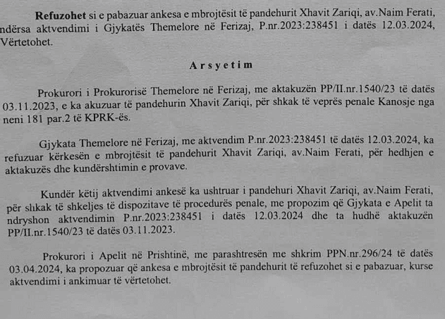 “Prokurori i Apelit në Prishtinë, me parashtresën me shkrim PPN.nr.296/24 të datës 03.04.2024, ka propozuar që ankesa e mbrojtësit të pandehurit të refuzohet si e pabazuar, kurse aktvendimi i ankimuar të vërtetohet”, thuhet në vendimin e Gjykatës së datës, 18.06.2024.