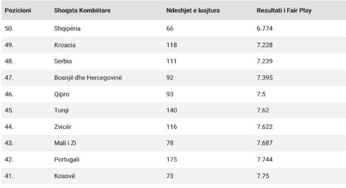 Në raportin e UEFA-s thuhet: “Shqipëria, një vend që nuk ka asnjë klub në asnjë nga tre garat kryesore të UEFA-s për klube, pjesën më të madhe të 66 ndeshjeve të tyre përfshijnë ekipin kombëtar A dhe të moshave, ndeshjet e të cilat, në përgjithësi, ka një rezultat të ulët të fair-play me një vlerësim pikësh prej 6.774 të ndjekur nga Kroacia me 7.228 dhe Serbia me 7.239 pikë, sit re vendet e fundit.”