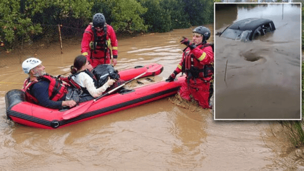 Pasagjerët u nxorën nga makina, e cila ishte fundosur në një zonë të përmbytur, me imazhe të operacionit të kapura në një video të publikuar nga Forecast Weather Greece.