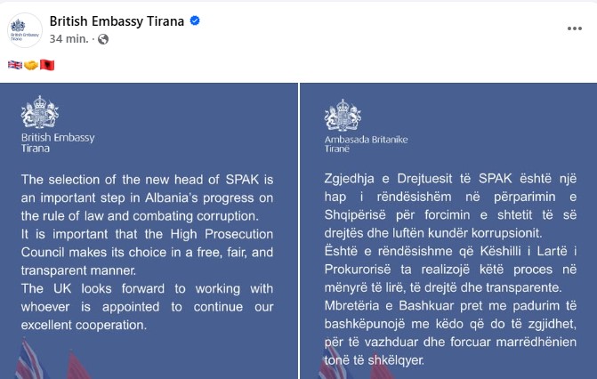 Ambasada Britanike reagon për zgjedhjen e kreut të ri të SPAK. Anëtarët e KLP do të votojnë nesër për drejtuesin e Prokurorisë së Posaçme i cili do të ketë një mandat 3-vjeçar.