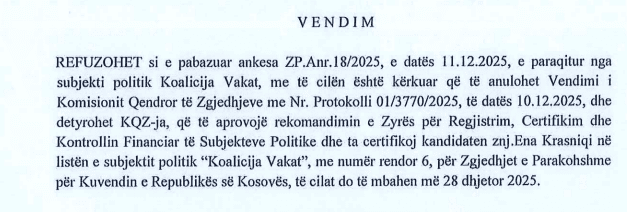 PZAP sot ka marrë vendim përmes të cilit ka refuzuar ankesën e koalicionit VAKAT, përmes të cilës kërkohej që Ena Krasniqi të regjistrohej si pjesë e listës për deputetë të kësaj partie.