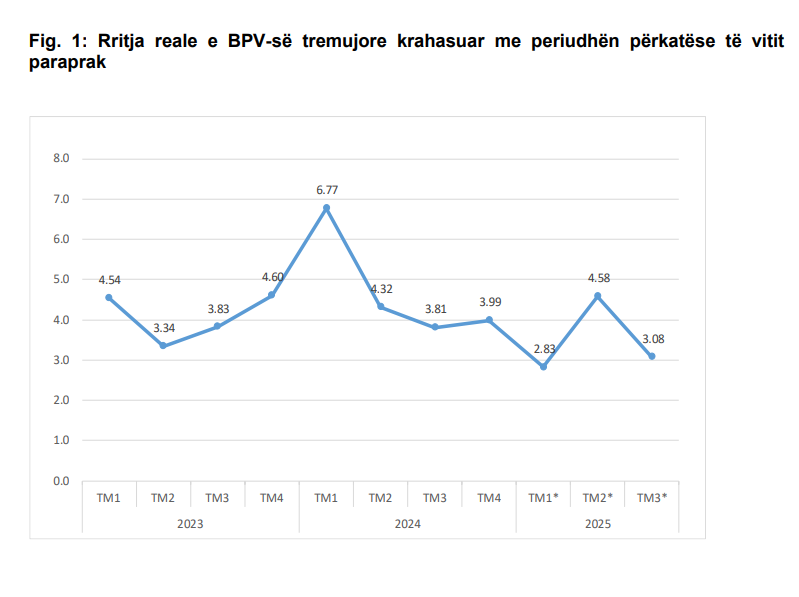 Në tremujorin e tretë të vitit 2025, BPV-ja shënoi një rritje reale prej 3.08% në krahasim me të njëjtën periudhë të vitit të kaluar. Megjithëse kjo tregon se ekonomia mbetet në territor pozitiv, norma e rritjes konsiderohet modeste, veçanërisht duke pasur parasysh se krahasimi bëhet me një bazë relativisht të ulët nga viti paraprak.