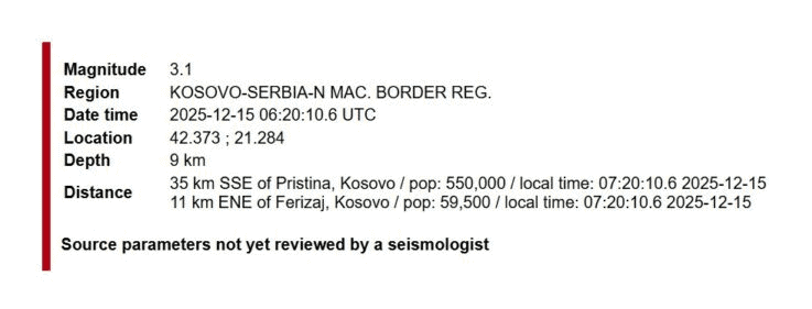 Një tërmet me magnitudë 3.1 ballë të shkallës Rihter është regjistruar sot në orët e hershme të mëngjesit në rajonin kufitar mes Kosovës, Serbisë dhe Maqedonisë së Veriut.