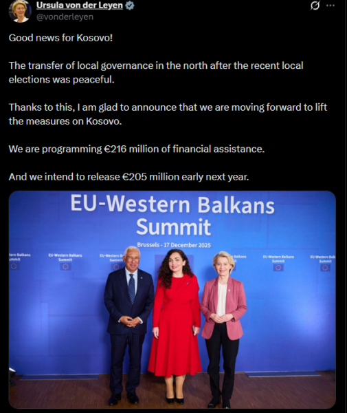 Presidentja e Këshillit Evropian, Ursula von der Leyen, gjatë samitit BE-Ballkani Perëndimor, tha lajmet se masat ndaj Kosovës po hiqen