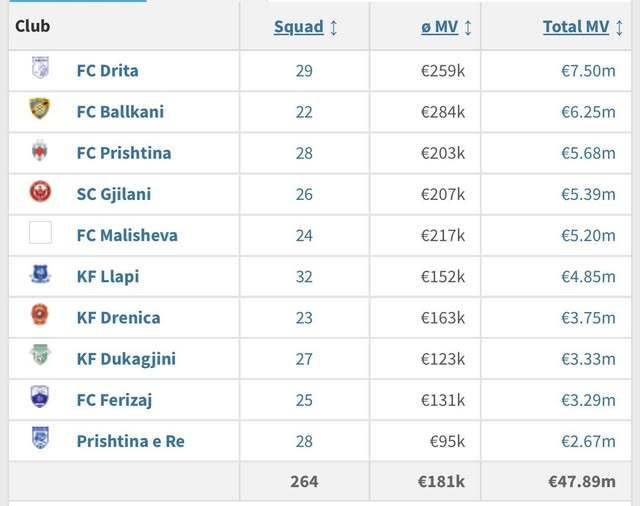 Transfermarkt ka publikuar vlerat e skuadrave të Superligës së Kosovës.