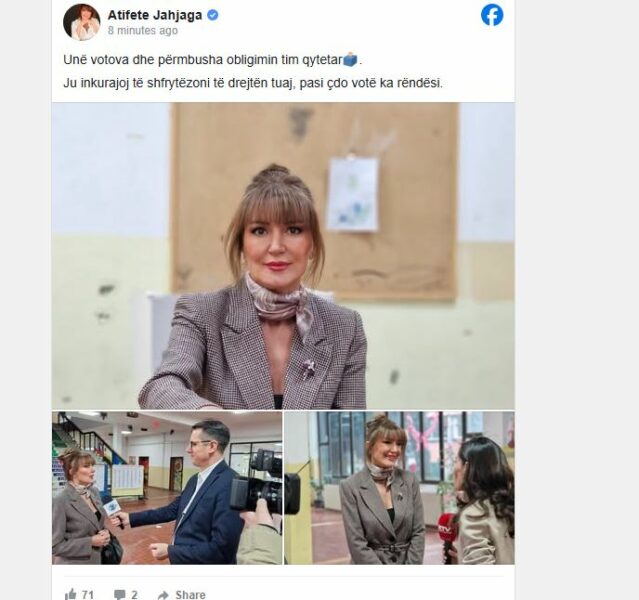 “Unë votova dhe përmbusha obligimin tim qytetar. Ju inkurajoj të shfrytëzoni të drejtën tuaj, pasi çdo votë ka rëndësi”, shkroi ajo.