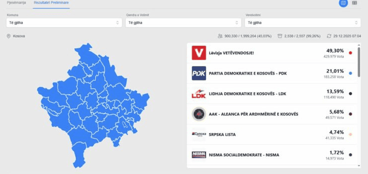 Lëvizja Vetëvendosje po prin me 49,30 për qind pasi ka marrë, deri tash, 429 mijë e 979 vota.