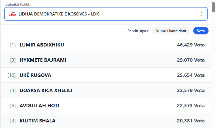 Më të votuarit në LDK pas numërimit të mbi 60% të votave Abdixhiku, Bajrami, Rugova