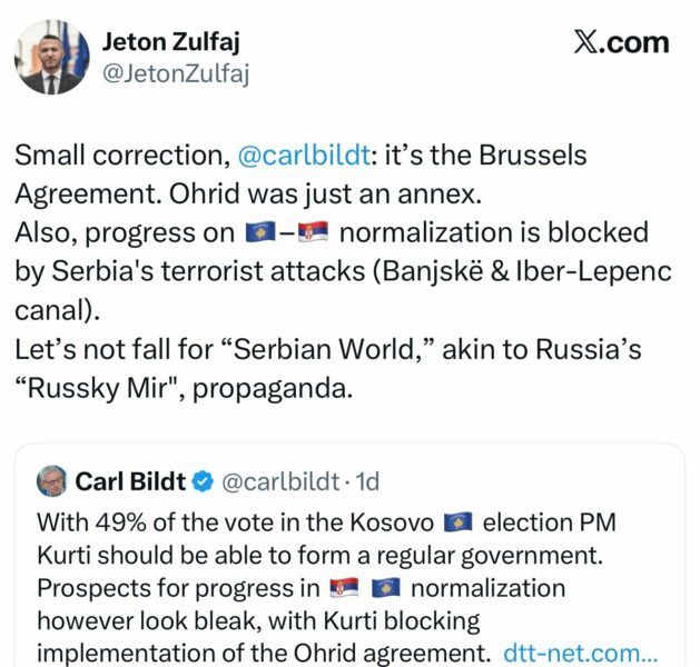 ‘’Një korrigjim i vogël, Carl Bildt: bëhet fjalë për Marrëveshjen e Brukselit. Ohri ishte vetëm një aneks i saj. Gjithashtu, përparimi në normalizimin mes Kosovës dhe Serbisë po bllokohet nga sulmet terroriste të Serbisë (Banjskë dhe kanali Ibër-Lepenc). Të mos biem pre e propagandës së “Botës Serbe”, e ngjashme me “Russky Mir” të Rusisë’’, ka shkruar ai.