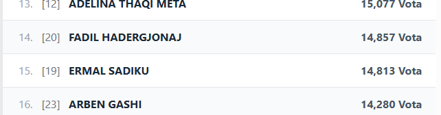 Sadiku është duke u ndjekur nga pas nga Arben Gashi i cili deri tani ka marrë 14 mijë e 280 vota, apo 533 vota më pak.