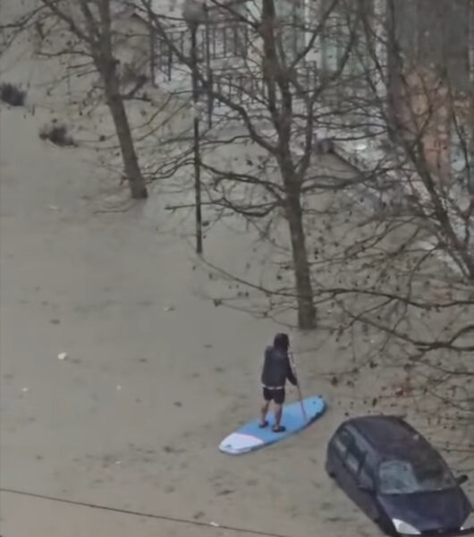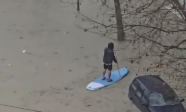 Lapsi.al ka siguruar një pamje ku shihet qytetari i cili ka përdorur një dërrasë sërfi dhe një lopatë për të lundruar.