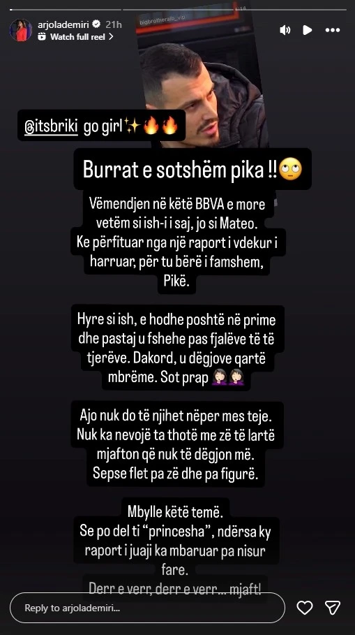 Përmes një postimi në rrjetet sociale, Arjola ka publikuar një video ku Mateo fliste sërish për raportin e tij me Brikenën, duke theksuar njohjen jashtë shtëpisë, çka nxiti reagimin e fortë të aktores tropojane.