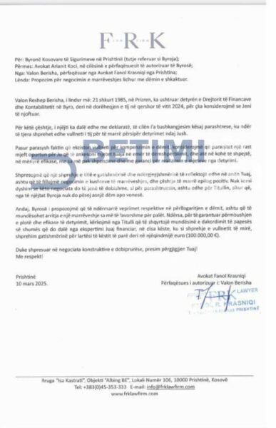 “Andaj, Byrosë i propozojmë që të ndërmarrë veprimet respektive në përllogaritje të dëmit, ashtu që të mundësohet arritja e një marrëveshje sa më të favorshme për palët. Ndërsa për të garantuar përmbushjen e plotë dhe efikase të detyrimit, kërkojme nga titulli që të shqyrtojë mundësinë e dakordimit të pageses së shumës që do të dalë nga eksperti juaj financiar, në disa këste, ku si shprehje e vullnetit të mirë, shprehim gatishmërinë për lartësi të këstit të parë deri në njëqindmijë euro (100,000.00€)”, thuhet në deklaratën e Berishës.