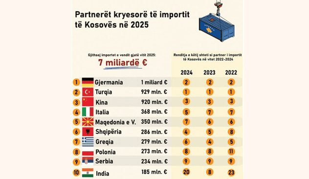 Të dhënat tregojnë diversitetin e partnerëve tregtarë të Kosovës, ku vendet evropiane mbajnë pjesën më të madhe të importeve, ndërsa shtetet aziatike dhe rajonale mbeten gjithashtu kontribuues të rëndësishëm në tregtinë e vendit.