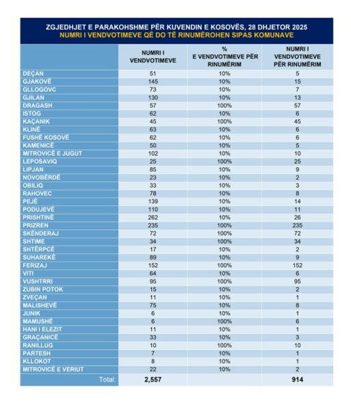 Komisioni Qendror i Zgjedhjeve, ka njoftuar se kanë marrë vendim për rinumërimin e 914 vendvotimeve që i takojnë të gjitha komunave të Kosovës.
