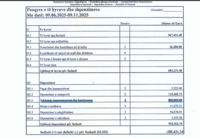 Nga këto shpenzime, 802 mijë e 265 euro kanë shkuar për reklama, konferenca e reprezentacion.