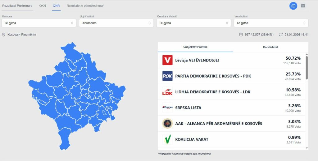 “Nga fillimi i këtij procesi (e martë, 13 janar 2026, ora 18:00) dhe deri më tani (e mërkurë, 21 janar 2026, ora 10:00) janë rinumëruar 834 nga 2,557 vendvotime. Sipas këtyre të dhënave, deri më tani rinumërimi është përmbyllur plotësisht në 7 komuna”, thanë nga KQZ.