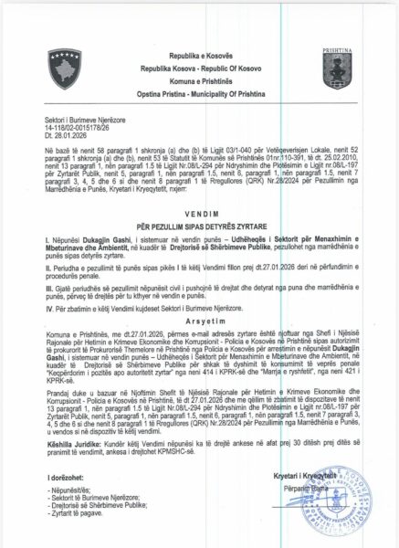 Rama tha se pezullimi nga puna do të jetë në fuqi deri në përfundimin e procedurave hetimore dhe gjyqësore.