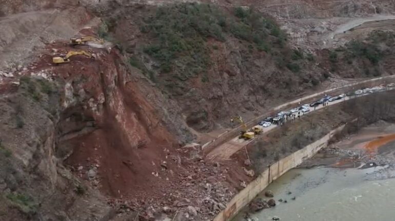 Në pamjet me dron të sigurura nga News24 shihet se si Kompania ANK shpk e cila po punon për ndërtimin e segmentit rrugor, pjesë e Korridorit Tetë, vijon punimet për shembjen e pjesës së rrezikshme në zonën e njohur si Kthesat e Dragostunjës.