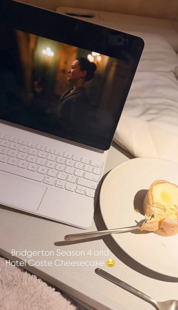 Në një prej postimeve, ylli i SKIMS shihet duke shijuar cheesecake në shtrat në Hotel Costes, ndërsa ndjek sezonin e katërt të hitit të Netflix, Bridgerton. “Bridgerton Season 4 and Hotel Coste cheesecake,” shkroi Kardashian mbi fotografi.