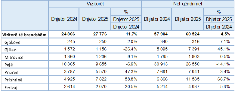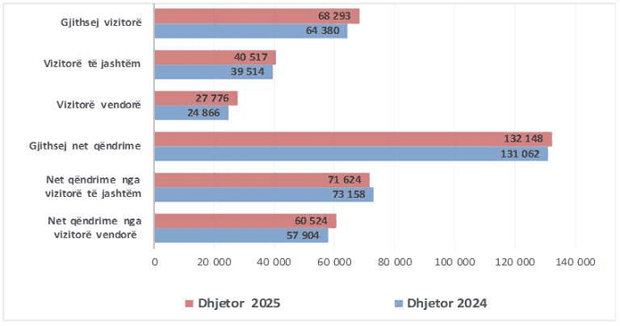 Në krahasim me dhjetorin e vitit 2024, kur ishin regjistruar 64 mijë e 380 vizitorë, numri i përgjithshëm i vizitorëve është rritur për 6.1 për qind.