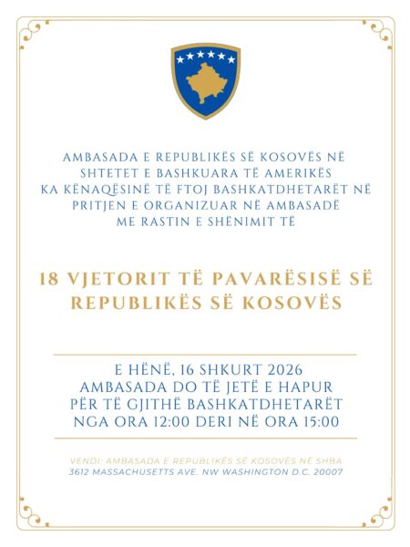 “Të dashur bashkatdhetarë, Jemi të nderuar dhe të kënaqur t’ju ftojmë të bashkoheni me ne në festimin e 18-vjetorit të Pavarësisë së Republikës së Kosovës në ambientet e Ambasadës në Uashington, D.C”, thuhet pëmes një njoftimi në “X”.