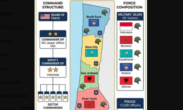 Petrit Selimi, ish-ministër i Jashtëm i Kosovës, ka publikuar në rrjetin social X një hartë që tregon një skenar sipas të cilit Ushtria e Kosovës do të marrë përgjegjësinë për sigurinë në pjesën veriore të Gazës.