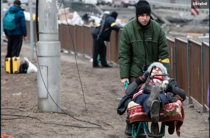 Ukrainë: Një grua duke u transportuar me karrocë, në mes të njerëzve që i ikën sulmeve ruse në Irpin, afër Kievit më 9 mars 2022.