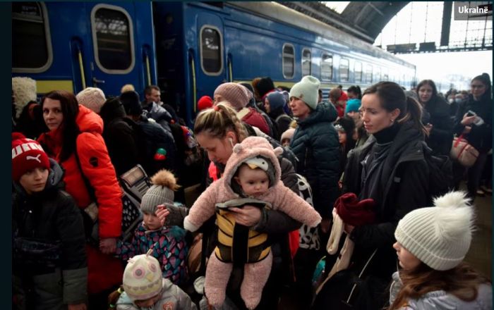 Ukrainë: Njerëz që ikin nga pushtimi rus i Ukrainës mblidhen në stacionin e trenit në Lviv, Ukrainë, 9 mars 2022. Rreth 6.9 milionë ukrainas janë detyruar të largohen nga Ukraina që nga fillimi i luftës më 24 shkurt 2022, sipas UNHCR. Ky është numri më i madh i refugjatëve në Evropë që nga Lufta e Dytë Botërore.