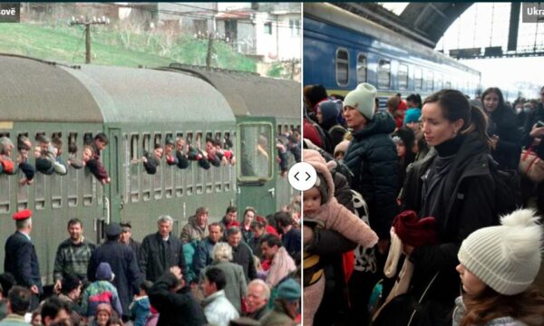![Kosovë: Një tren i mbipopulluar në Prishtinë duke transportuar refugjatë të shumtë shqiptarë, që largoheshin nga Kosova drejt Maqedonisë [tashmë Maqedonisë së Veriut] më 1 prill 1999. Sipas UNHCR, 800 deri 900 mijë shqiptarë janë detyruar të largohen nga vendi gjatë luftës së viteve 1998–1999.Ukrainë: Njerëz që ikin nga pushtimi rus i Ukrainës mblidhen në stacionin e trenit në Lviv, Ukrainë, 9 mars 2022. Rreth 6.9 milionë ukrainas janë detyruar të largohen nga Ukraina që nga fillimi i luftës më 24 shkurt 2022, sipas UNHCR. Ky është numri më i madh i refugjatëve në Evropë që nga Lufta e Dytë Botërore.](https://gdb.rferl.org/b524e2e5-878d-4b67-3bbc-08de3c92853e_w1023_n_s.jpg)