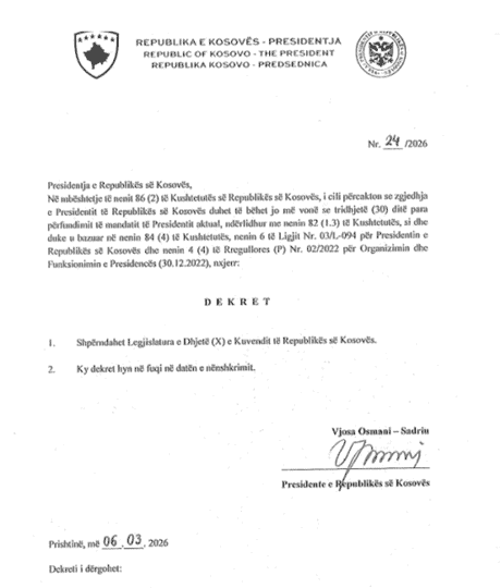 Në një shkresë zyrtare për deputetët e Kuvendit, kryetarja Haxhiu u ka bashkëngjitur edhe dekretin e presidents.