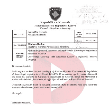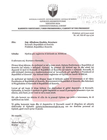 Po ashtu, ajo ju deputetëve iu ka dërguar edhe regjistrimin e kërkesës me numër K.068/26 të Gjykatës Kushtetuese të bërë nga Kryetarja e Kuvendit dhe nëntë (9) deputetë të Kuvendit të Republikës së Kosovës lidhur me vlerësimin e kushtetutshmërisë së ,,Procedurës për zgjedhjen e Presidentit të Republikës së Kosovës.