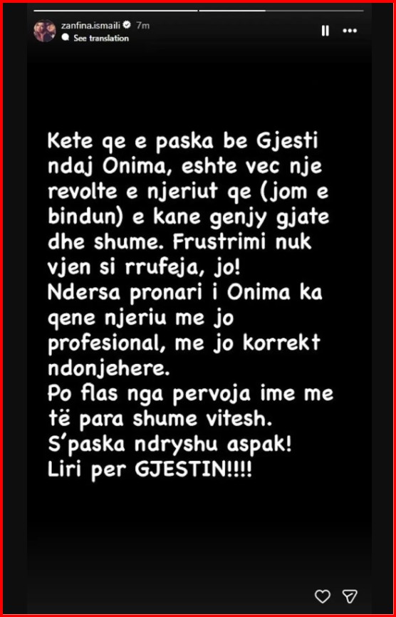 Frustrimi nuk vjen si rrufeja, jo! Ndërsa pronari i Onima ka qenë njeriu më jo profesional, më jo korrekt ndonjëherë. Po flas nga përvoja ime para shumë vitesh. S’paska ndryshuar aspak! Liri për Gjestin”, ka shkruar Zanfina në InstaStory.