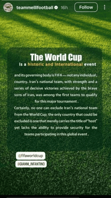 ‘Botërori është një ngjarje historike dhe ndërkombëtare dhe organizmi drejtues i tij është FIFA dhe jo ndonjë vend çfarëdo-thekson përfaqësuesja e Iranit-kombetarja iraniane falë forcës dhe fitoreve vendimtare të marra nga djemtë kurajozë të Iranit, ishte ndër të parat ekipe që u kualifikuan për këtë turne të rëndësishëm. Sigurisht askush nuk mund të përjashtojë kombëtaren iraniane nga Botërori; i vetmi vend që mund te ishte përjashtuar është ai që mban vetëm titullin e pritësit të eventit, por që nuk është në gjendje që të garantojë sigurinë e skuadrave pjesëmarrëse në këtë event global’.
