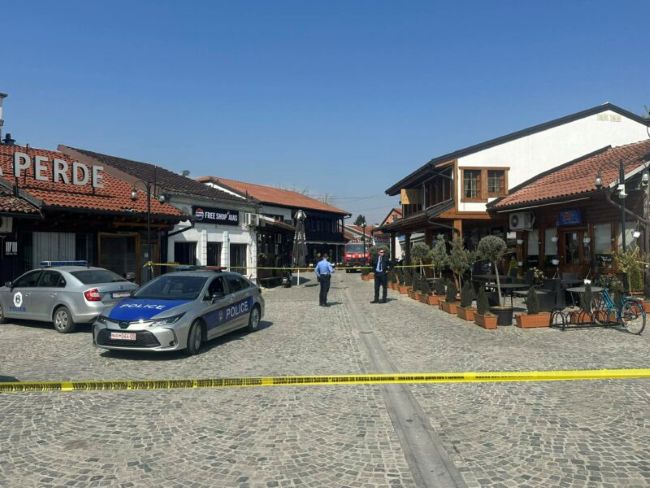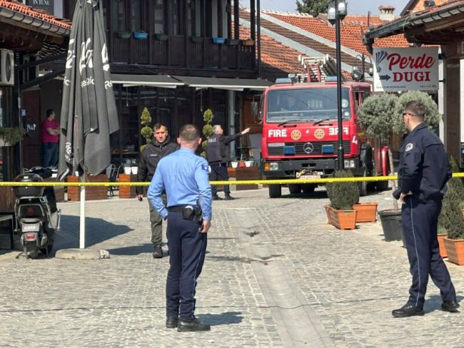 Në mes të rrugës shihet një automjet zjarrfikës i pozicionuar pranë lokaleve, ndërsa patrullat policore dhe hetuesit po vazhdojnë procedurat në vendin e ngjarjes. Një pjesë e zonës është e boshatisur, ndërsa aktiviteti i zakonshëm i mëngjesit në këtë pjesë të qytetit duket se është ndërprerë.