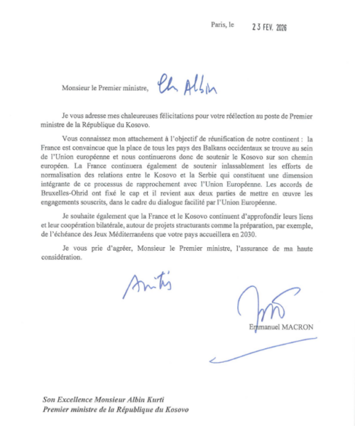 Presidenti i Francës, Emmanuel Macron, i ka dërguar kryeministrit të Kosovës, Albin Kurti një letër urimi më 23 shkurt, për ta uruar për mandatin e ri qeverisës.