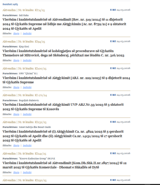 Tek seksioni i vendimeve, Kushtetuesja vetëm sot ka publikuar tetë vendimet që lidhen me kërkesa të ndryshme të individëve, ndërkohë që pritet vendimmarrja.
