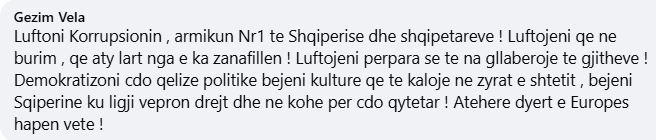 “Luftojeni përpara se të na gllabërojë të gjithëve ! Demokratizoni cdo qelizë politike bëjeni kulturë që të kalojë në zyrat e shtetit , bëjeni Shqipërinë ku ligji vepron drejt dhe në kohe për cdo qytetar ! Atëherë dyert e Europës hapen vetë!”, shkruan qytetari.