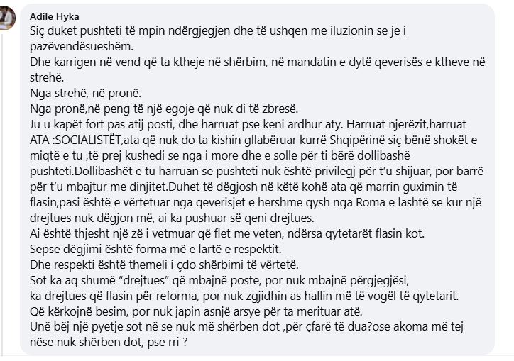 Në fund ajo e mbyll komentin duke theksuar se respekti është themeli i çdo shërbimi publik të vërtetë dhe i besimit qytetar.