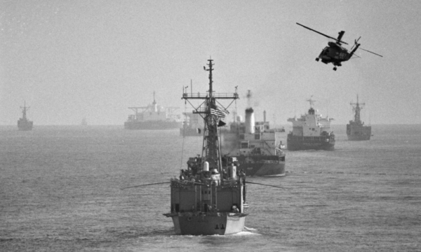 Një helikopter ndjek një anije amerikane dhe disa cisterna që po lundronin në Gjirin Persik në qershor të vitit 1988.